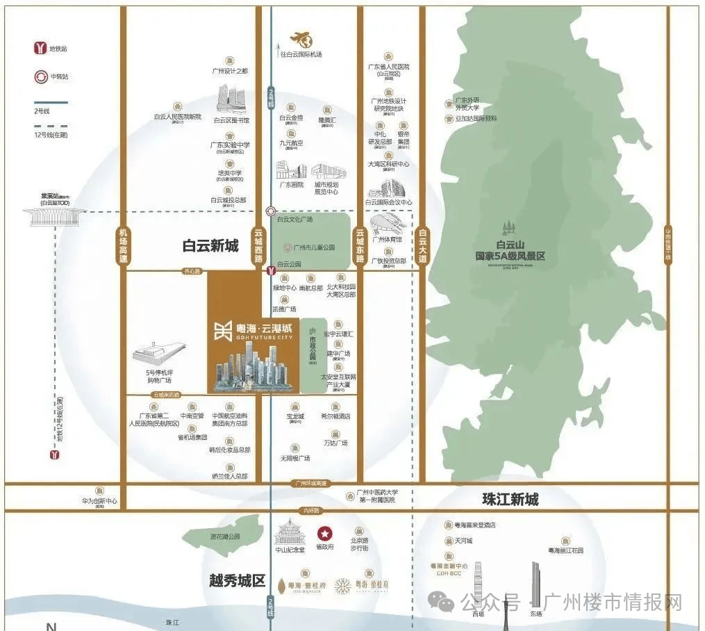 项目紧邻广州市儿童公园、白云文化广场、广州体育馆、广州市城市规划展览中心、广东画院、白云国际会议中心等六大省市级地标建筑,南航三大总部、无限极总部、地铁设计院总院等总部大楼环绕在旁,共同构筑了一个高端、商务、国际化的生活圈层。
