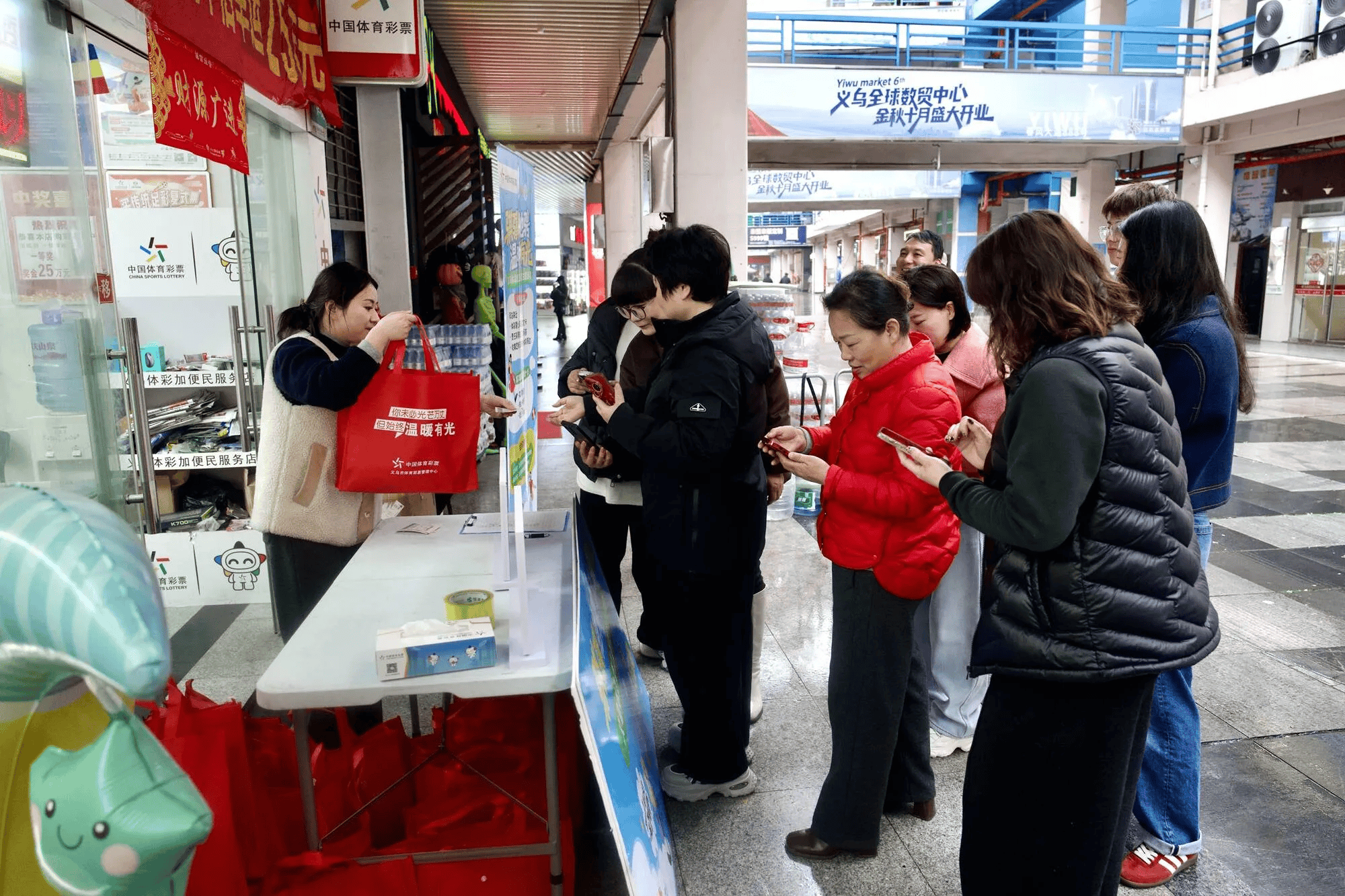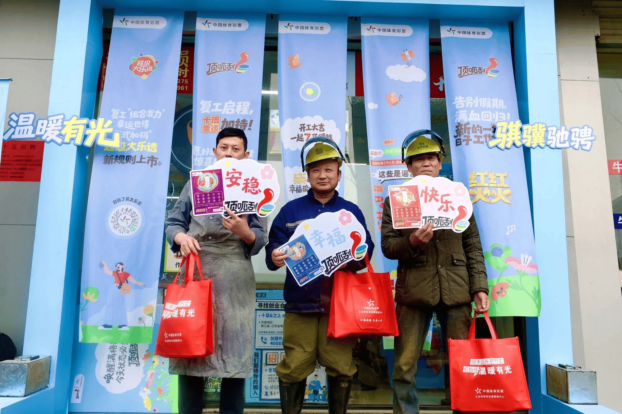 贴心的话语,暖心的服务,体彩复工系列活动走到浙江义乌,为返岗环卫工人、快递小哥、出租车司机等一线群体免费发放了“复工能量包”,赢得阵阵好评。建筑工人陈师傅直言:“复工能量包里有保温杯、纸巾、红糖、彩票和马年玩偶,又实用又有趣”。