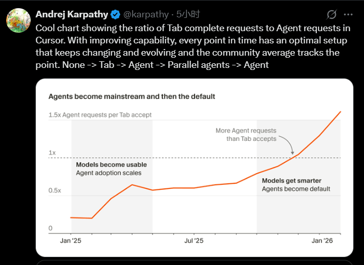 过去的2025,即随着模型能力的提升,Cursor 用户的使用习惯已经从“Tab”转向了 Agent!