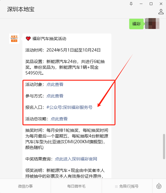 可以打开深圳福彩服务号或在【深圳本地宝】公众号,在后台对话框回复【福彩】即可获取报名入口、中奖查询入口/流程、如何领奖、需要缴税吗、中奖汽车包含上牌费和保险吗等信息。