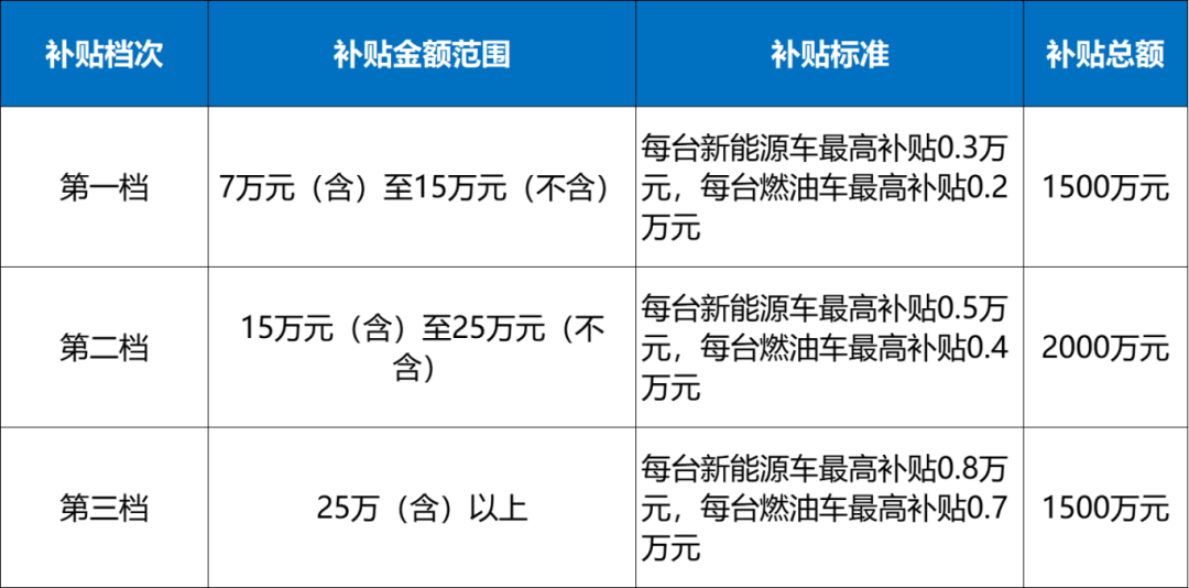 燃油车补贴7000元,新能源车补贴8000元,该档设置补贴总额1000万元